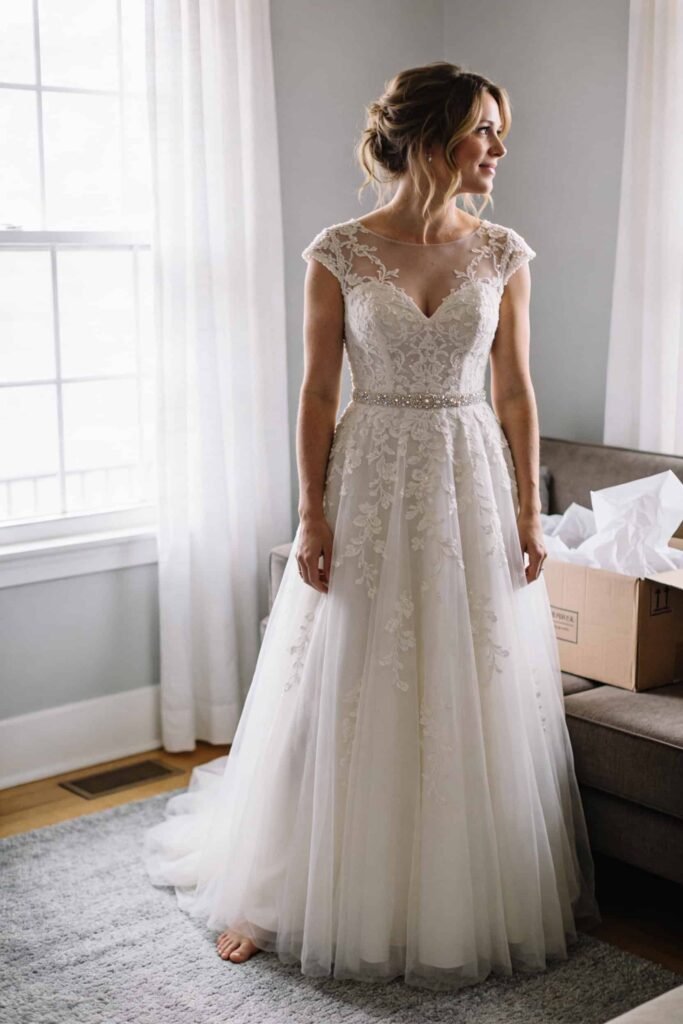 Sizing and fit: Always consult the brand’s specific size chart — bridal sizing runs differently from regular clothing. When in doubt, size up and plan for alterations ($15–$300 on average at David’s Bridal). If you’re ordering from Azazie or CocoMelody, take advantage of their custom-sizing services.