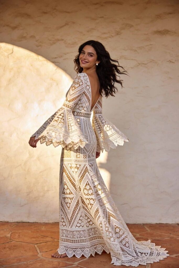 For the free-spirited bride who wants all-over lace with a bohemian soul, Dreamers and Lovers delivers. Their gowns are known for romantic lace overlays, open backs, and effortless silhouettes that look stunning in natural settings.
