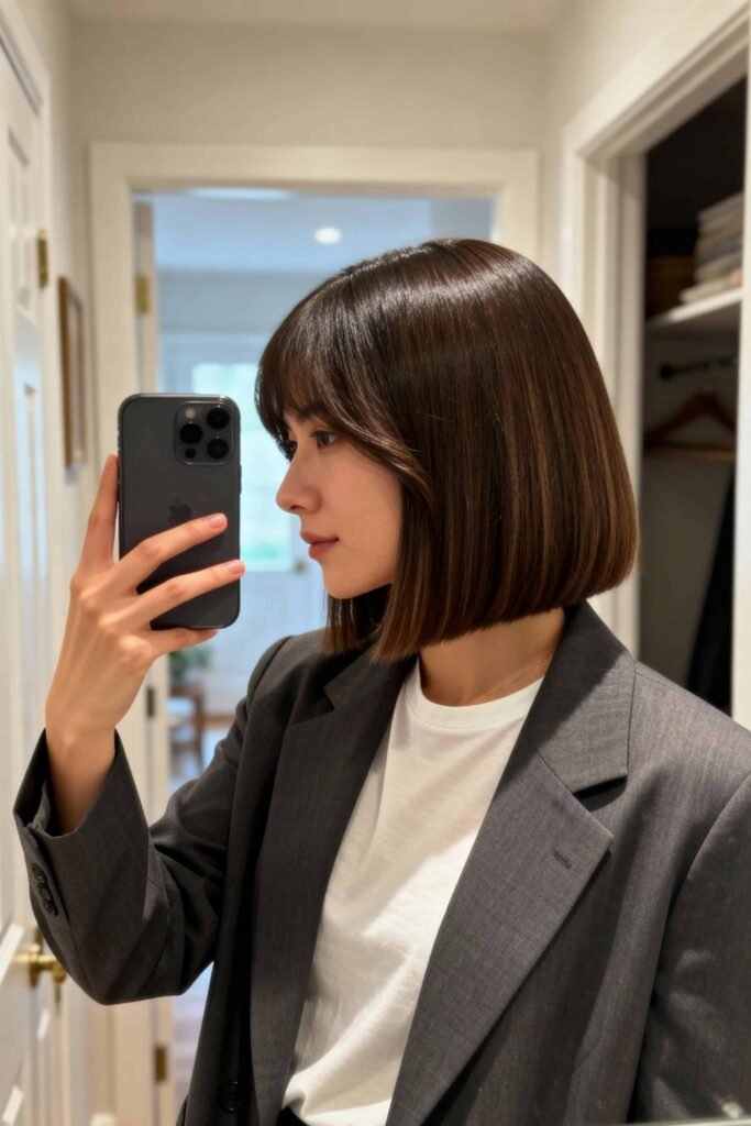 This is a sharp, architectural cut. By removing the “feathery” ends, your hair appears instantly thicker. It hits right at the collarbone or just above. It is chemically friendly—meaning it looks great with solid colors like platinum blonde or jet black.