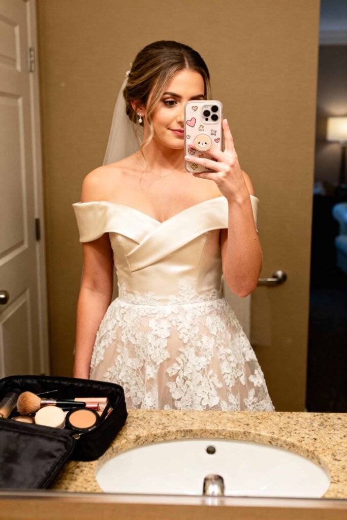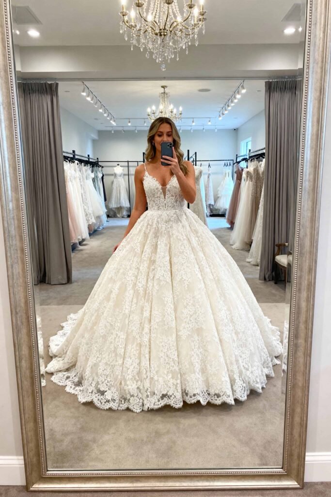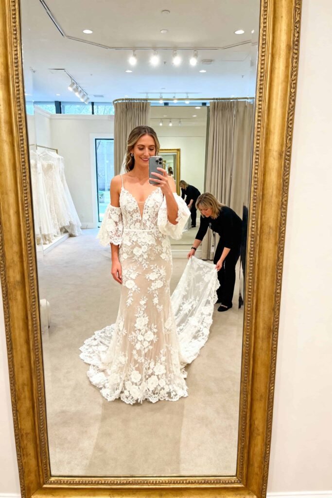Budget for alterations! Hemming a lace dress is labor-intensive because the seamstress often has to remove the scalloped lace edge, cut the hem, and re-attach the edge by hand. Expect to pay $300–$600+ for standard bridal alterations on a lace gown.