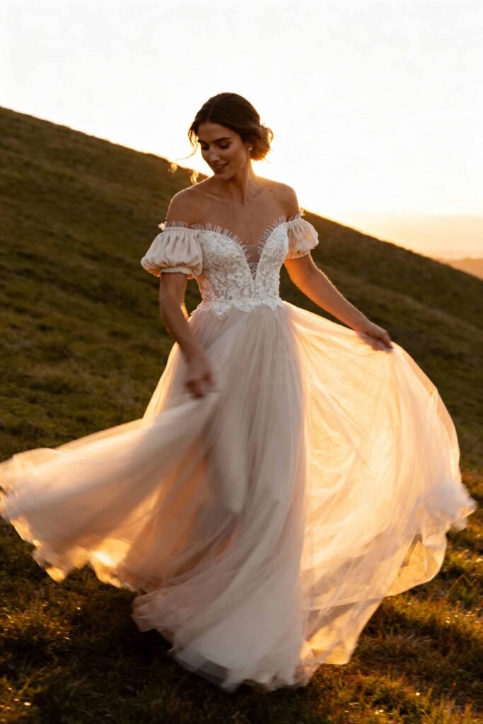 A realistic full-length photo of a bride wearing the Wtoo Miles gown standing in a sunlit meadow. 2:3 aspect ratio. Soft golden hour lighting. The dress features off-the-shoulder sleeves and a flowy mesh skirt. No text overlays.