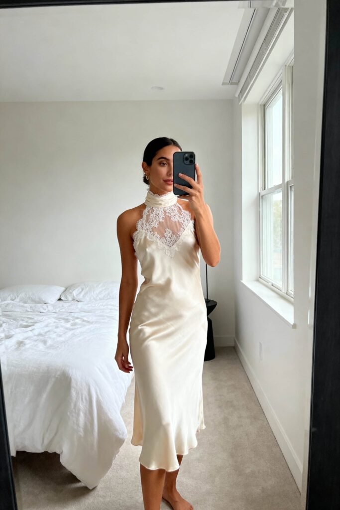 - Silk charmeuse is unforgiving with undergarments (seamless skin-tone shapewear is a must).