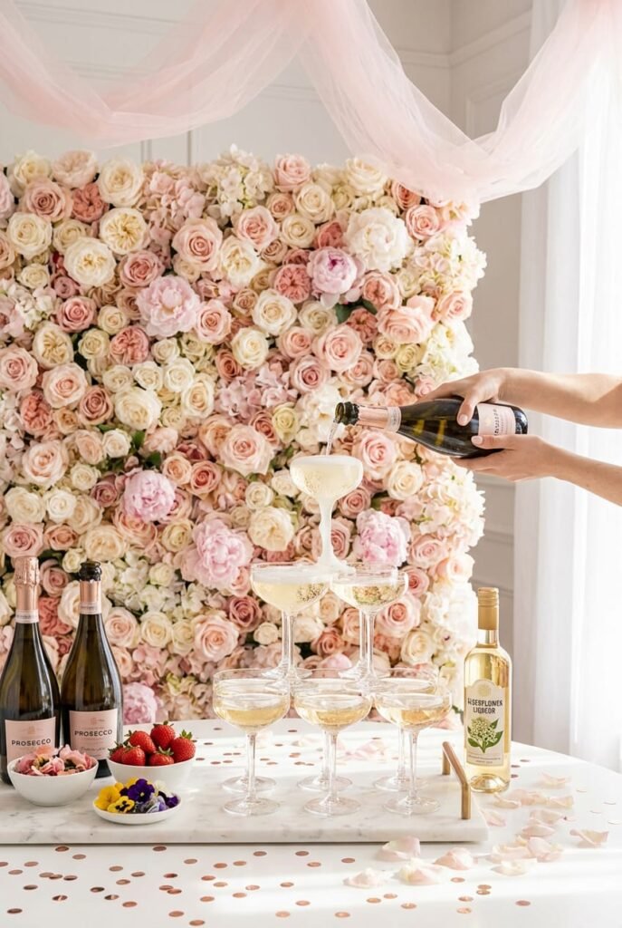 Florals meet fizz — think flower walls ($150–$400 rental, or DIY with silk flowers for $40–$80), prosecco towers, and petal-strewn tables. Set up a build-your-own prosecco bar with berries and edible flowers. Budget $30–$60 per guest. It’s extremely photogenic and feels luxurious without a luxury price tag. Pinterest trending data and Dotellabelle confirm its rapidly growing popularity, though it requires more styling effort than simpler themes.