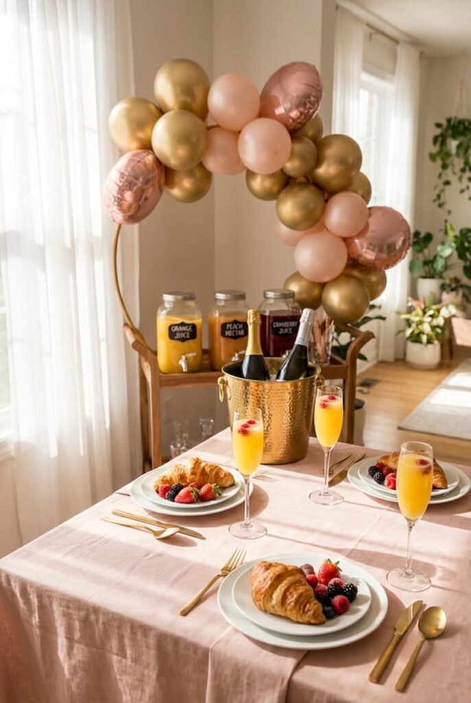 A champagne-fueled brunch with a DIY mimosa bar. Set out 3–5 juice options alongside prosecco ($8–$15/bottle), serve waffles and pastries, and keep décor simple — gold accents, blush linens, and a balloon arch. Complete decoration kits run $15–$40 on Amazon (checked March 2026). Expect $15–$35 per guest at home, or $25–$50 per person at a restaurant private room (David’s Bridal). It ranked first because it scored highest across every single criterion — affordable, easy, photogenic, and universally loved. Shutterfly and Loverly both name it a perennial favorite.