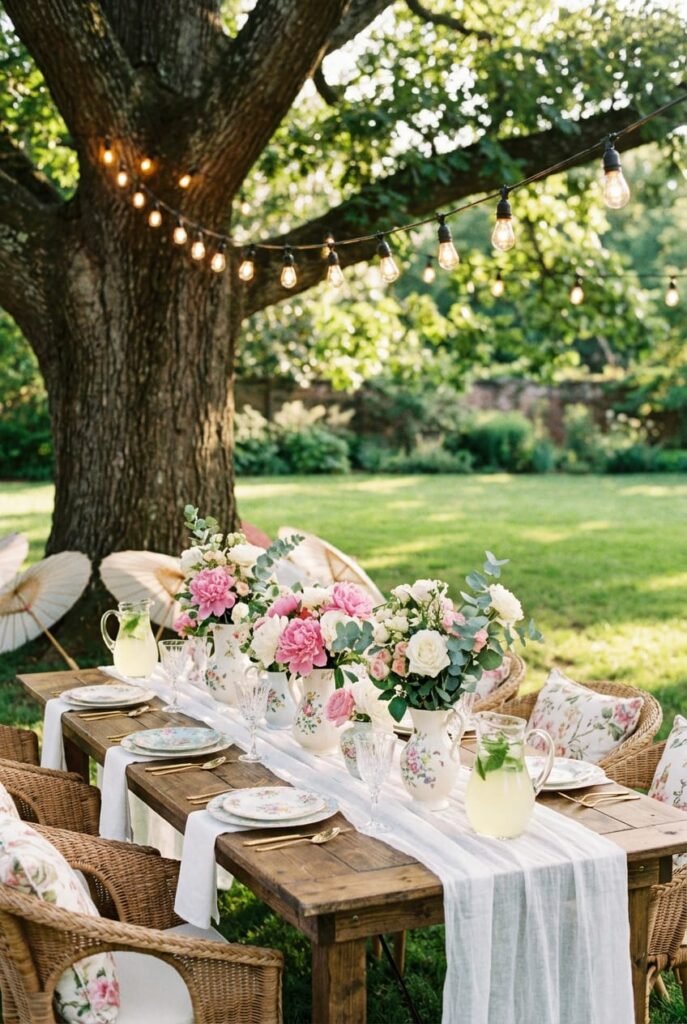 An outdoor celebration draped in flowers, greenery, and soft light. Host in a backyard or greenhouse ($150–$600 rental). Layer mismatched vintage vases, fresh seasonal florals ($30–$80 for centerpieces), and linen tablecloths. Serve finger sandwiches and sparkling lemonade. Add a DIY floral crown station for interactive fun. Budget roughly $25–$50 per guest. Weather-dependent, so always have a backup plan. Shutterfly, Savvy Swarey, and Bergen Linen all feature it as a top pick — it’s one of the most visually stunning themes with moderate effort.