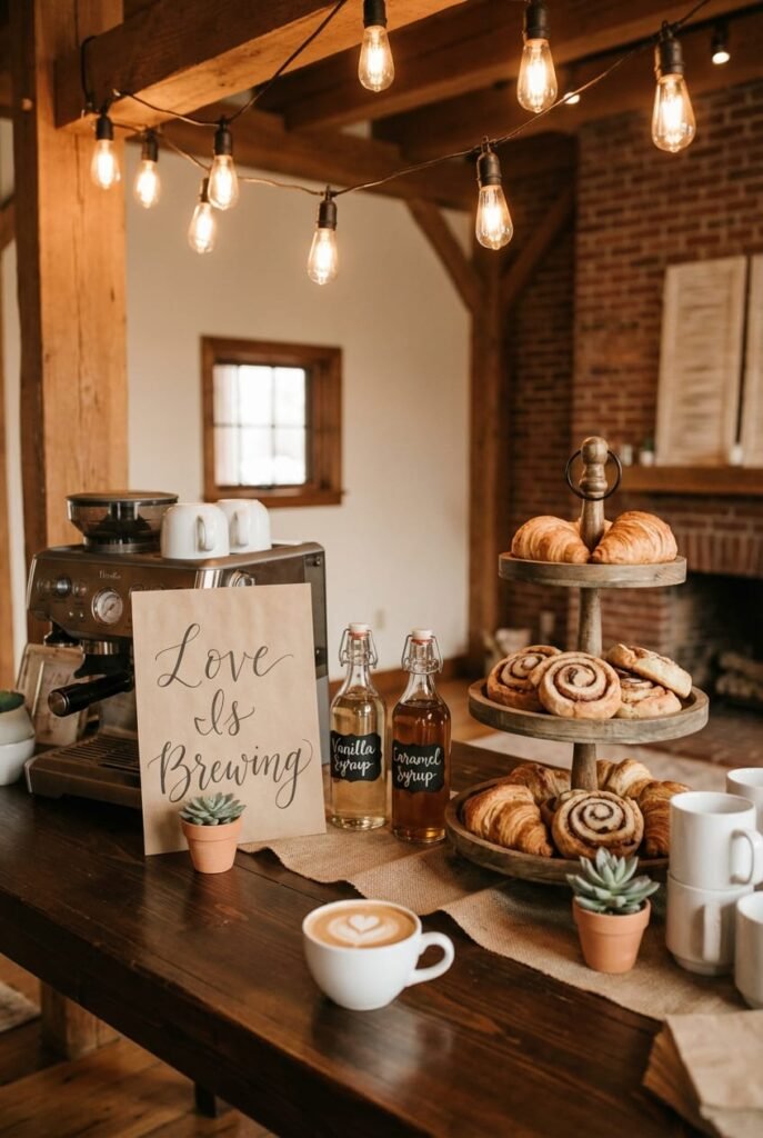 A coffee-lover’s shower built around a DIY latte bar with flavored syrups ($8–$12/bottle on Amazon), various milks, and an espresso machine. Pair with croissants and cinnamon rolls. Themed décor kits on Etsy start at $12–$30. Budget $15–$30 per guest at home, or $200–$500 for a barista cart rental. Dotellabelle reports it’s one of the most-read themes among 2026 brides. Perfect for fall, winter, or any bride whose personality is basically coffee.