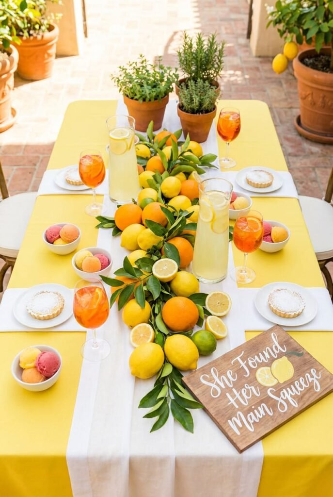 A citrus-powered celebration with lemon and orange centerpieces (just $5–$15 at the grocery store), bold yellow tablecloths, and Aperol spritzes. Serve lemon tarts and citrus sorbet. Themed supply bundles on Etsy run $10–$25. At $15–$35 per guest, it’s one of the most affordable themes on this list — real fruit doubles as both décor and food. Shutterfly and TikTok trend lists feature it as a 2025–2026 breakout. Just make sure it matches the bride’s personality.