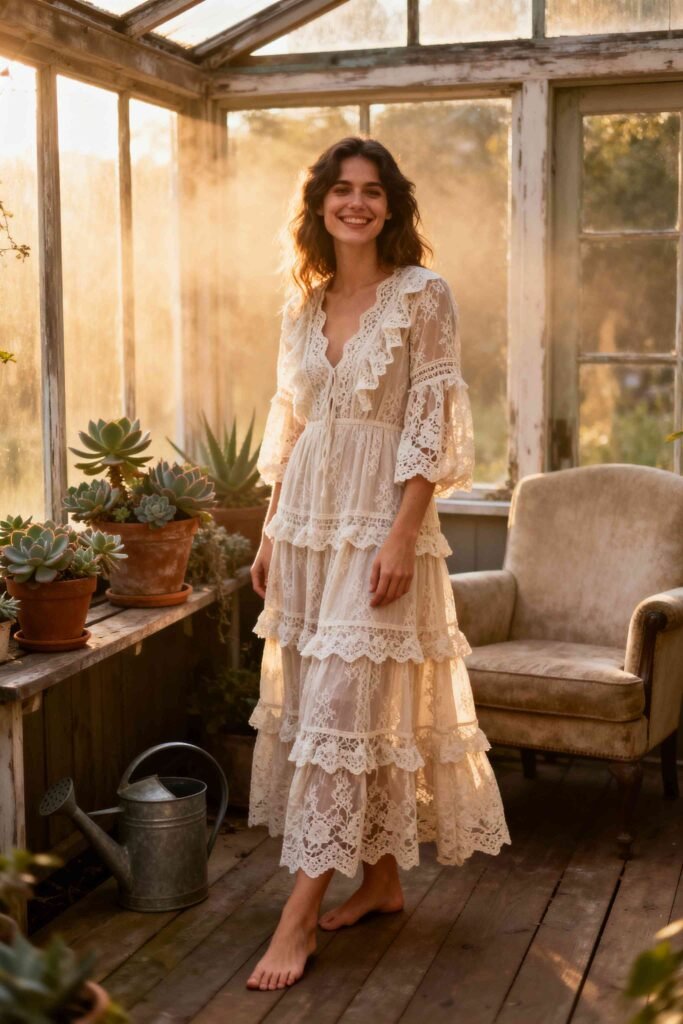 | Free People | Tiered Maxi | Cotton/Lace | Boho/Rustic | XS–XL | $128 |