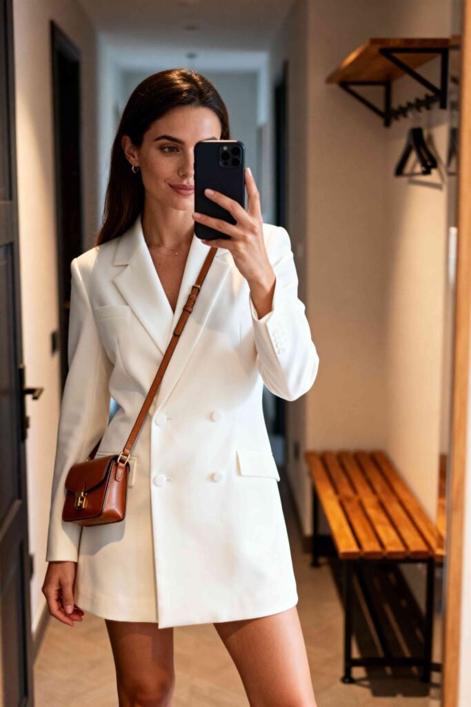 - Styling Ideas: A tailored blazer over shoulders and pointed pumps.