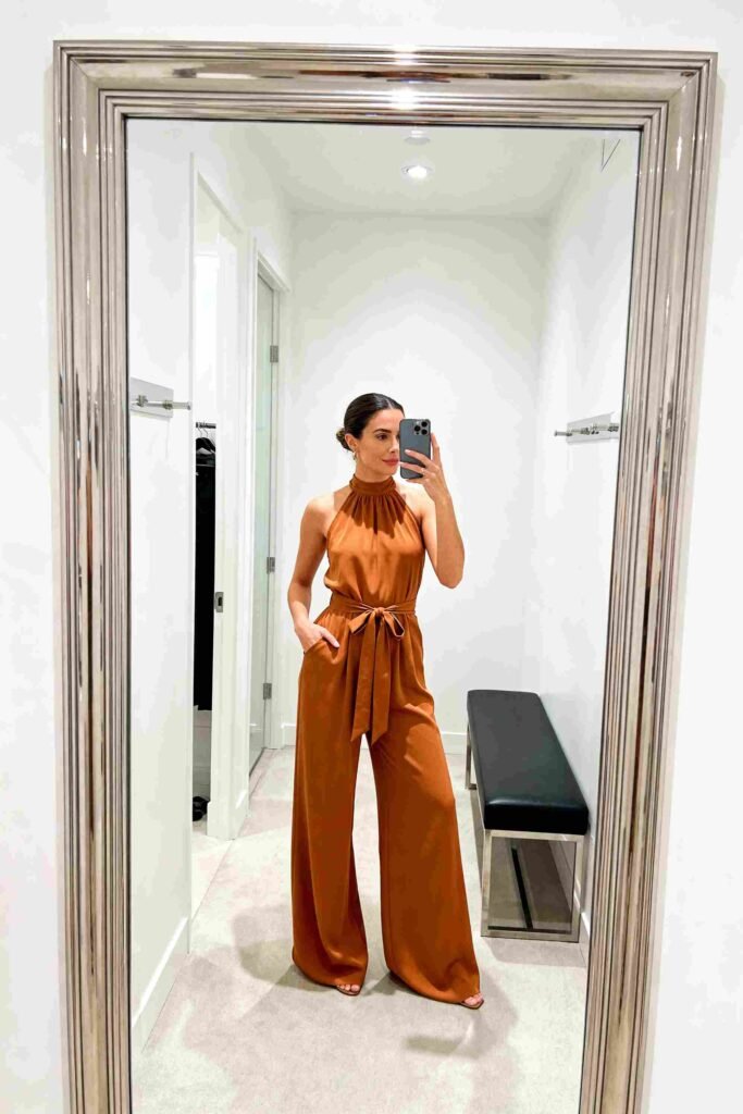 - Key Details: A high halter neck with a wide-leg pant that mimics the flow of a gown but offers the freedom of pants. Often features pockets and a tie waist.
