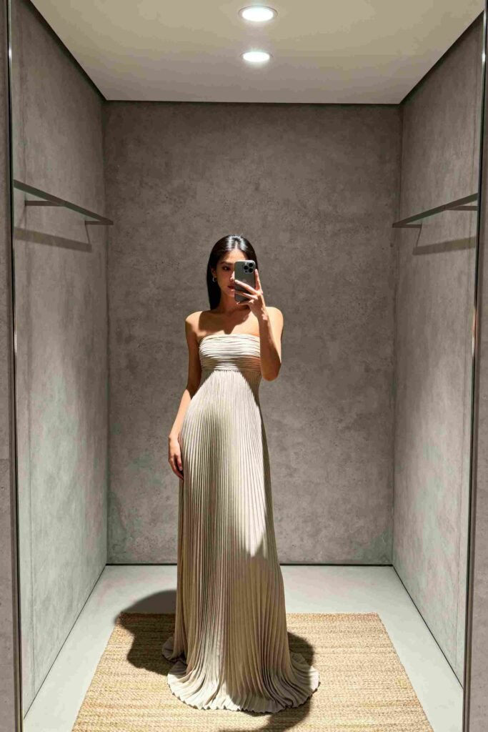 One-Line Verdict: A sophisticated pleated gown that elevates beach attire without being stuffy.
