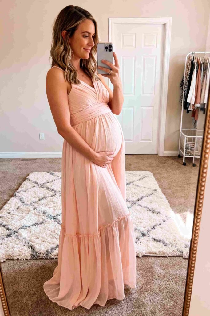 - Key Details: Designed with extra fabric in the skirt to accommodate a growing bump without hiking up in the front. The chiffon is lightweight, and the V-necklines often allow for nursing access later.