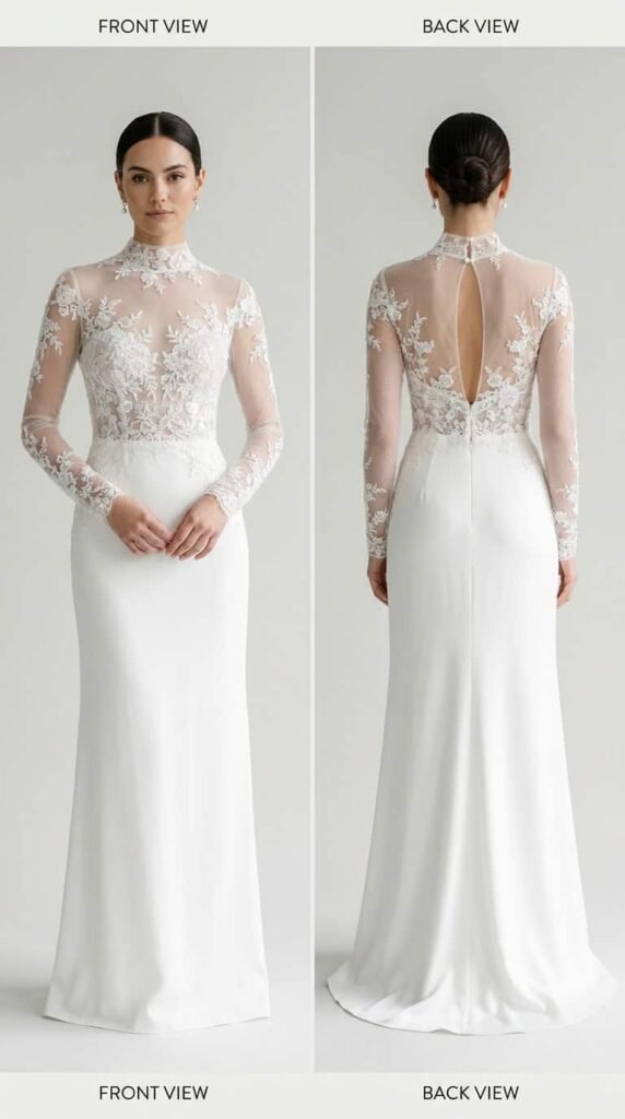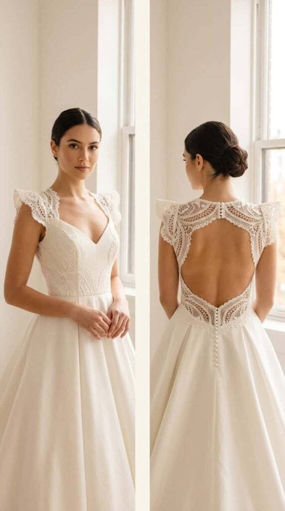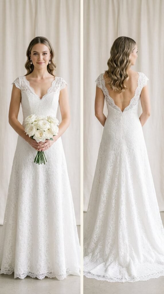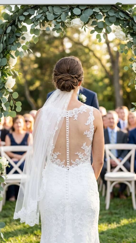 The back matters more than the front. Your guests see the back of your dress for the entire ceremony. Invest in lace back detail — illusion panels, lace buttons, open back lace trim — even if the front is simple.