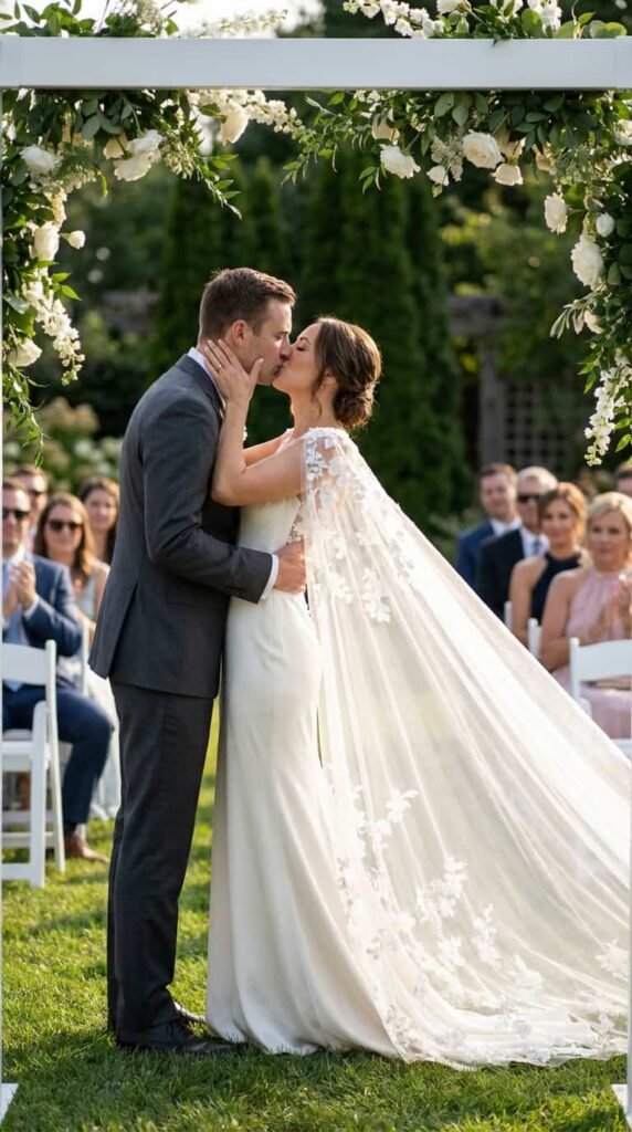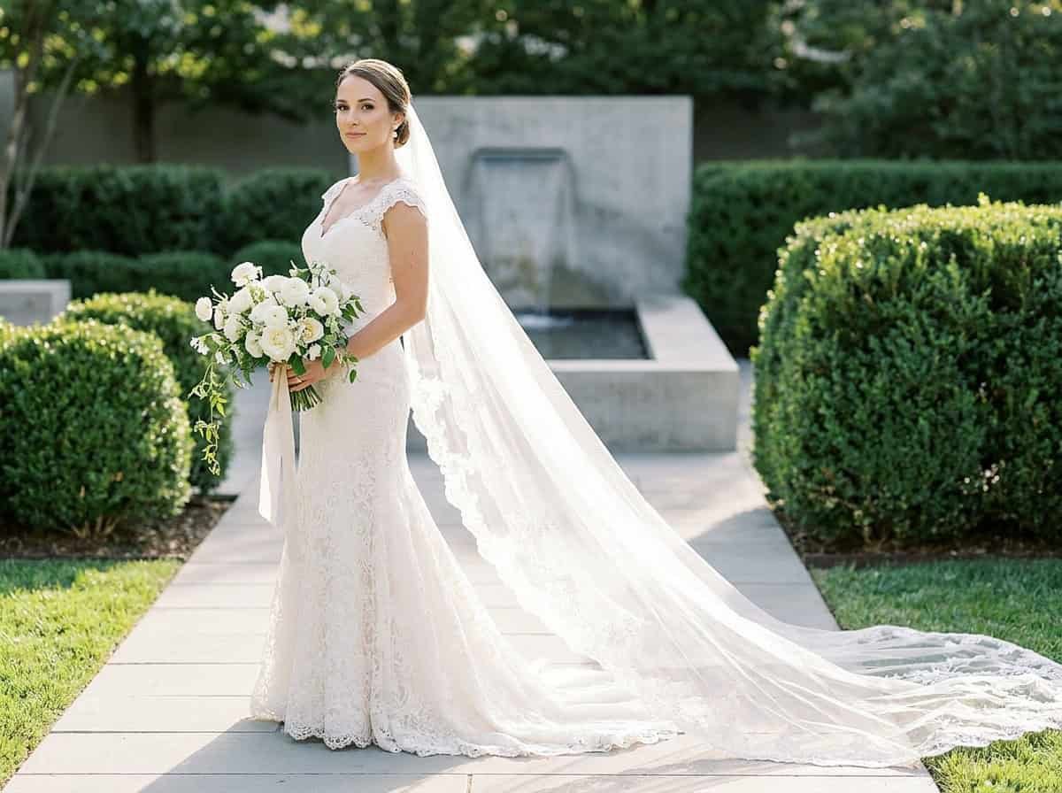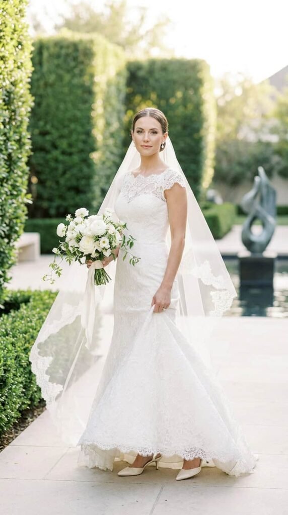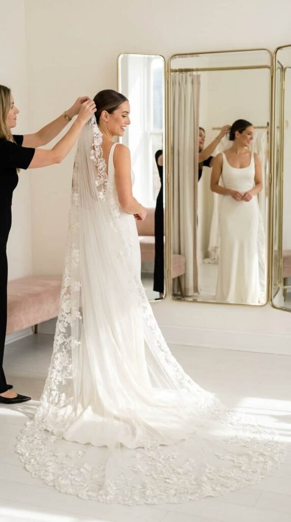 $300–900 depending on designer. A cathedral-length veil with an intricately embroidered lace border at the edge. The lace catches light when you walk and photographs like you’re floating. Pair with a minimal gown to let the veil do the talking.
