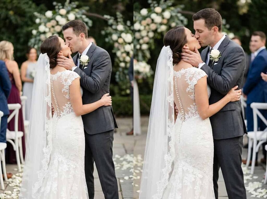 About $1,900. The most-Pinned lace wedding dress detail of 2026 — a sheer Chantilly illusion back with a row of tiny covered lace buttons trailing down the spine. Guests see the back of your dress for your entire ceremony. This is what they’ll remember.