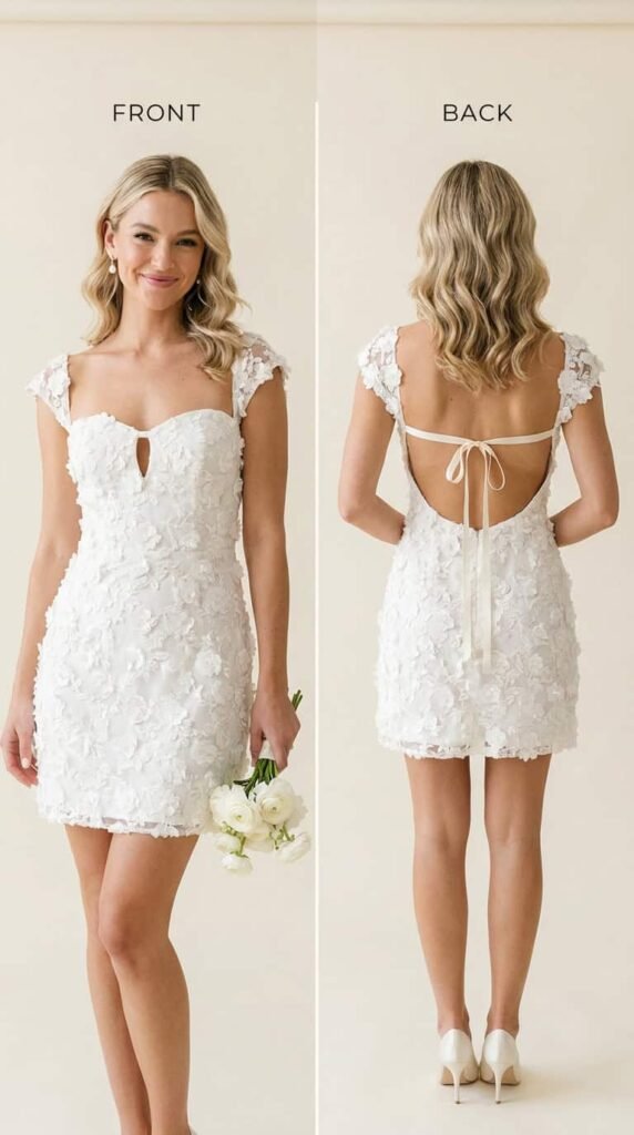Around $600. Knee-length with allover 3D floral lace, strapless sweetheart neckline with a small keyhole, and cap sleeves. For a courthouse ceremony, a dance-floor reception change, or a small intimate wedding. Fun, fresh, and one of the most modern lace wedding dresses I’ve seen at this price point.