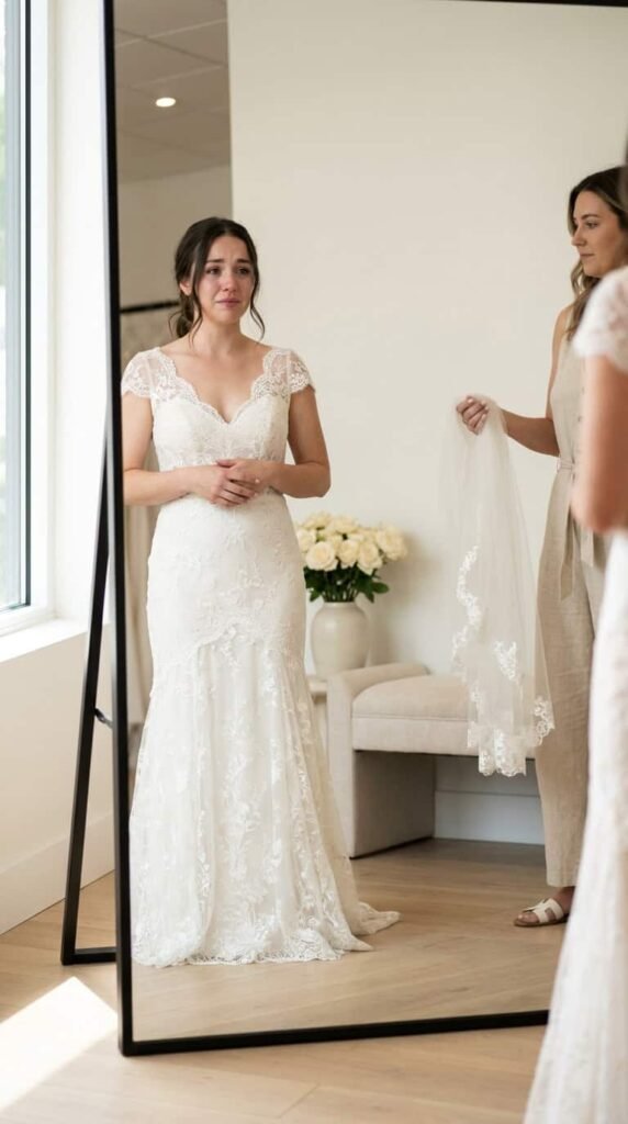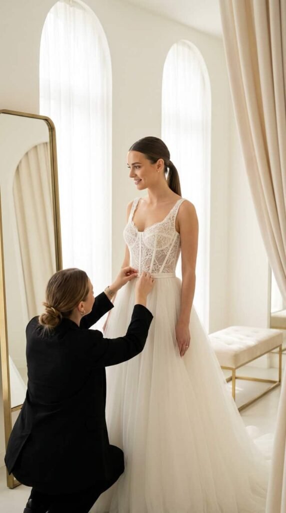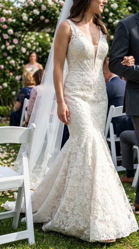 Test how lace moves on you. Dense lace holds shape, fine lace drapes. Some brides want structure, some want flow. Ask the bridal consultant to put a fan on in the fitting room and watch how the skirt moves before you commit.