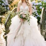 Starting around $5,800 at select bridal boutiques. I know. But this is the dress that made me understand what whimsical actually means in bridal. The tulle layers are so lightweight they move when you breathe. The 3D floral appliqués are hand-placed and they catch light with this almost holographic shimmer that photographs like something from a fairy tale. The structured corset underneath gives you incredible shape while the exterior looks completely effortless — like you floated out of a garden. When I saw a bride try this on at a trunk show, the consultant behind me actually teared up. It’s that kind of dress. If you’re having an outdoor or garden ceremony, this is the one.