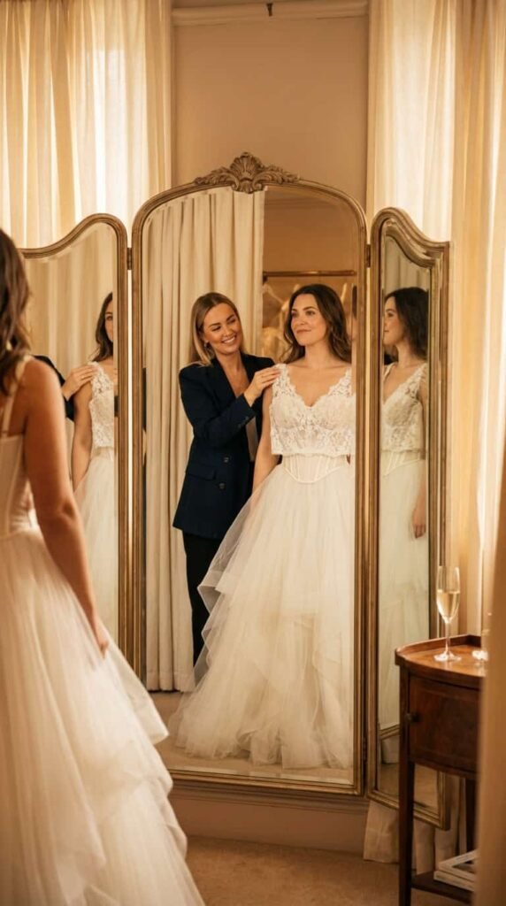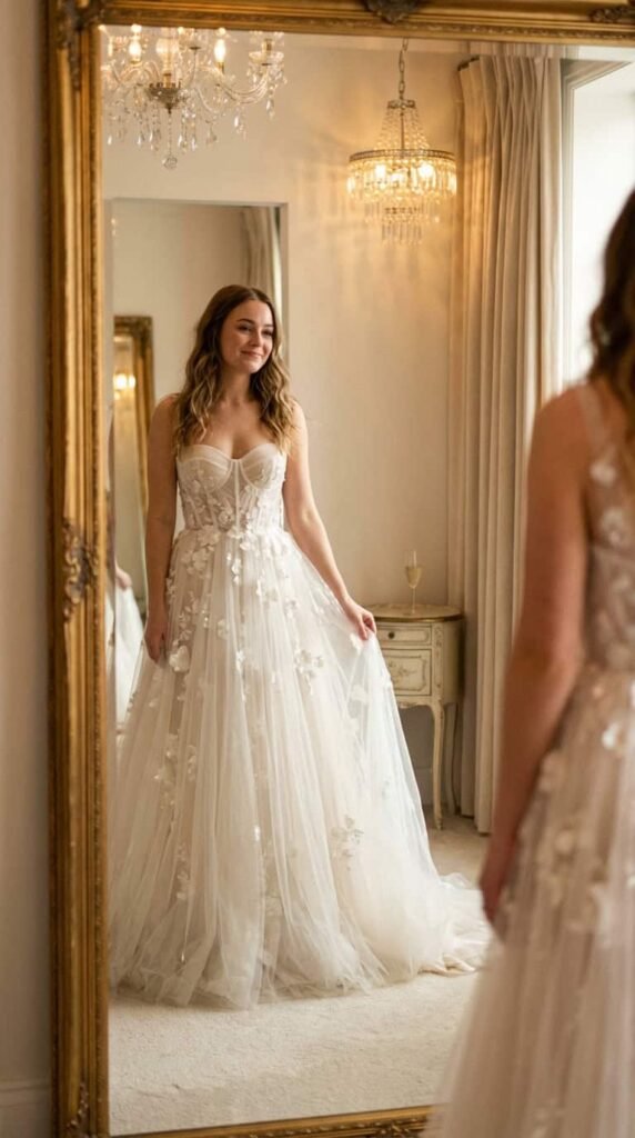 Movement is everything. Ask your bridal consultant to turn on a fan in the fitting room. A whimsical dress should come alive with air — if it sits flat and stiff, the magic dies in outdoor photos.
