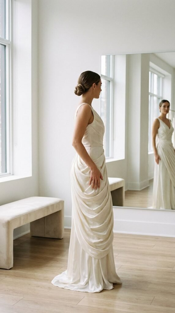 About $2,400. For the minimalist-whimsical bride. The silk drapes are sculptural and poetic — they skim the body and ripple when you walk. No lace, no beading, just the most beautiful fabric doing all the work. I’d pair this with a cathedral veil to add the drama.