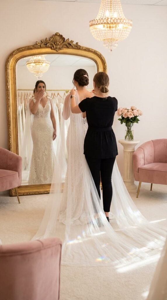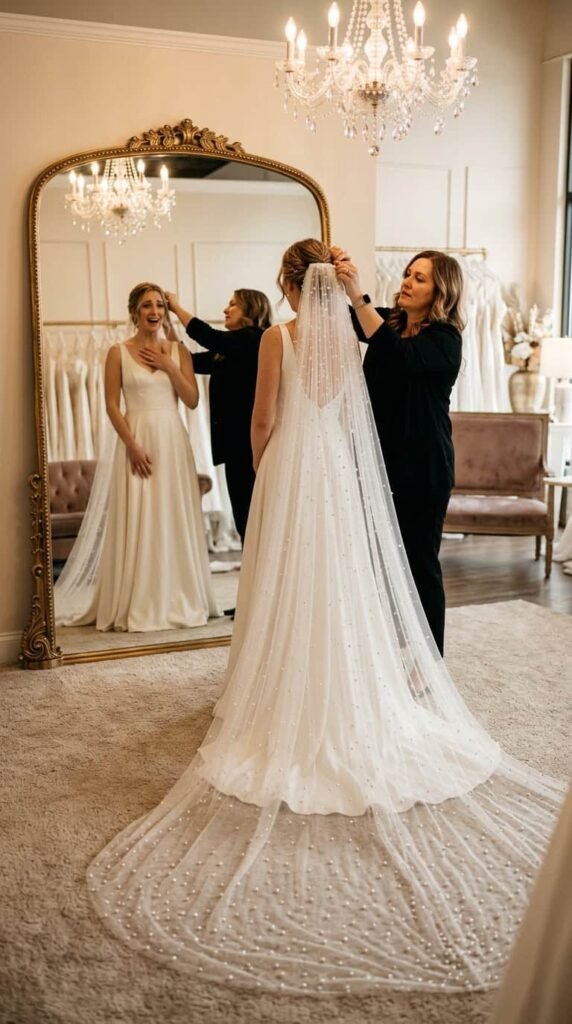 Try it with a veil before you decide. Even the simplest gown transforms when you add a cathedral veil or a tulle cape. Don’t say no to a dress until you’ve seen it with accessories.