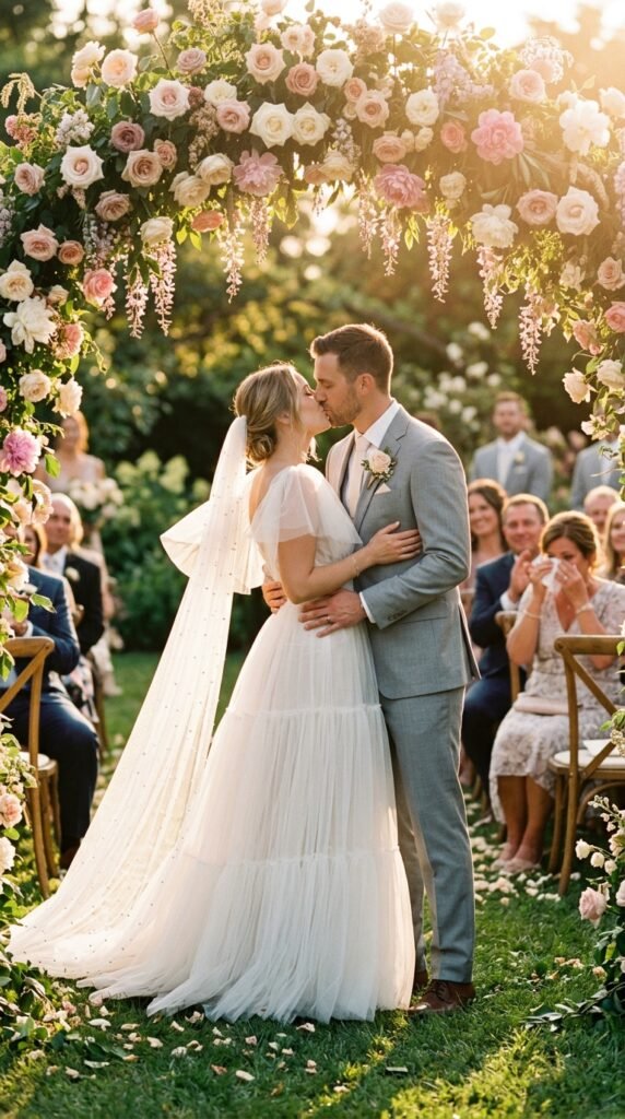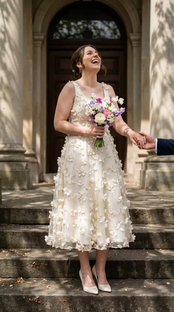 If I’m recommending one gown, it’s the Mira Zwillinger floral A-line for the bride with the budget, or the BHLDN flutter-sleeve for the bride who wants that same energy without the price tag. But honestly, the Needle & Thread midi might be the most versatile whimsical wedding dress on this list because it works for every ceremony type.