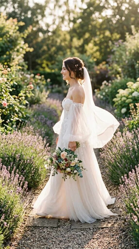 $150–300 on Etsy. Add flutter or bishop sleeves to any strapless or sleeveless gown. The tulle drapes over your arms and creates that ethereal silhouette for ceremony photos, then you remove them for dancing. The 2026 bridal trend I’m most excited about.