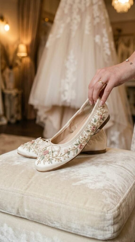 Around $280. Ivory satin ballet flats with delicate floral embroidery. You will not think about your feet once during your ceremony, which matters more than heel height. They peek out beautifully under an A-line or ballgown skirt.