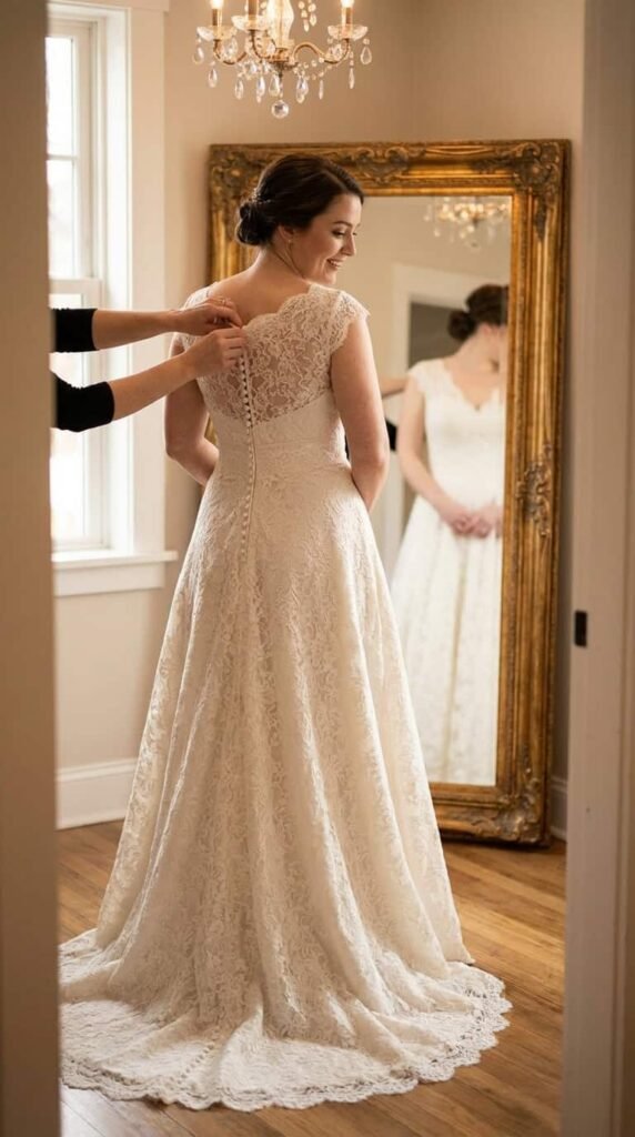 About $1,800. The matte Chantilly lace feels vintage and soft, not stiff or shiny. A basque waist elongates the torso, and the delicate scalloped hemline gives it a fairy-tale finish. This is the whimsical wedding dress for brides who want romance without excessive sparkle.