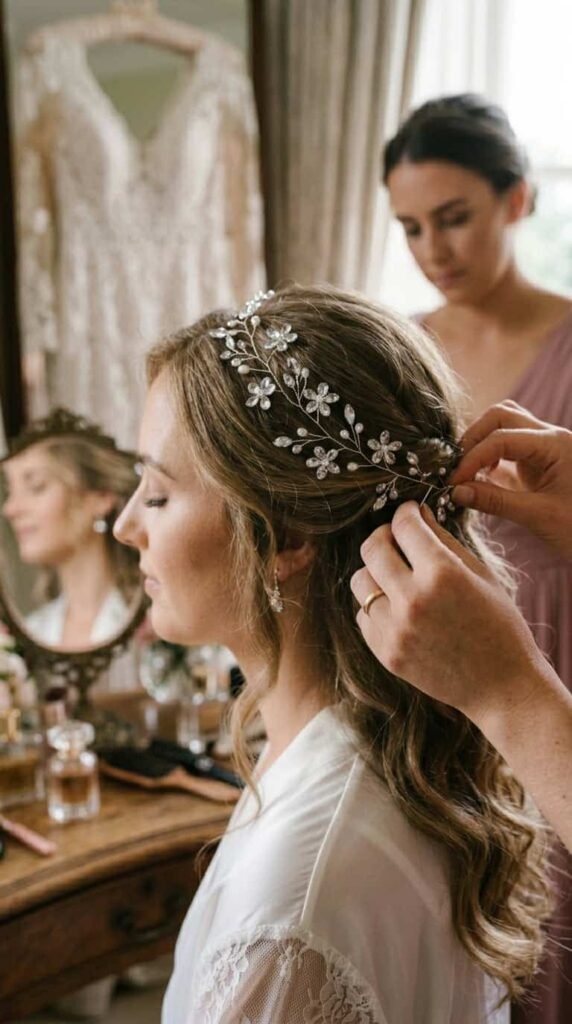 Around $120. Delicate wire vine with tiny crystal flowers woven through your hair instead of a traditional headpiece. It catches light from every angle and looks like it grew there. Works with both updos and loose waves.