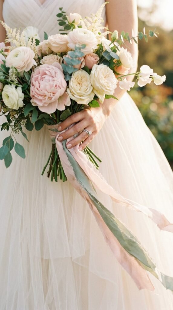 $20–50. Replace the traditional white satin wrap on your bouquet with raw-edge silk ribbon in blush, lavender, or sage trailing down. It photographs beautifully in wind and adds that handmade, romantic detail.