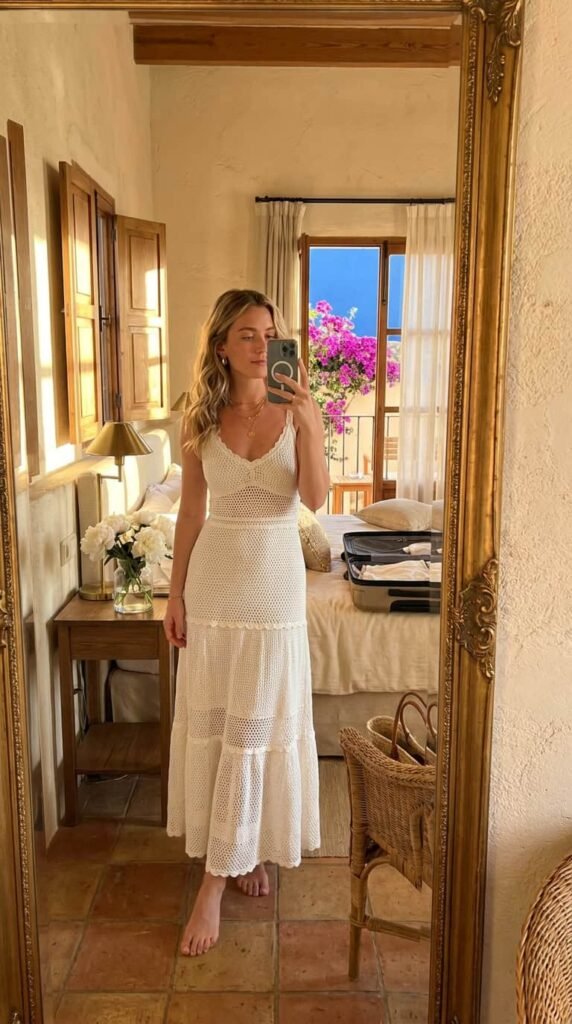 Around $295 at LoveShackFancy. Romantic crochet maxi with delicate scalloped edges, V-neckline, and trailing tiered skirt. THE honeymoon dress for Mediterranean villa dinners and golden-hour beach photos. Worth every penny for the photos alone.