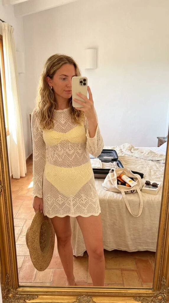 $60–140 depending on brand. White or cream crochet cover-up with a high-leg bikini in cream or butter yellow. The poolside outfit that photographs like a vacation magazine. Pack it for every beach day.