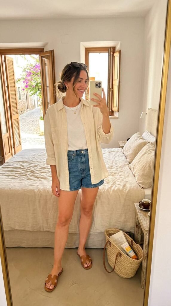 12. Denim Shorts + White Tee + Linen Button-Down — Mix and Match