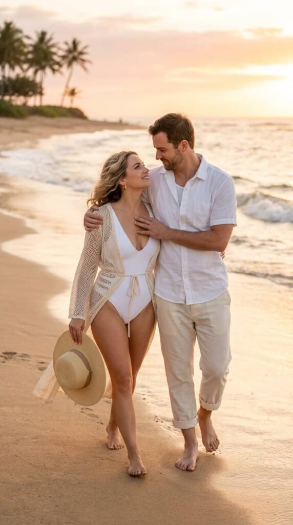 Pick a color story before you shop. White, cream, soft blush, butter yellow, and one accent (sage green, terracotta, or navy) creates an entire honeymoon wardrobe that photographs beautifully no matter the destination. Don’t pack outfits that fight each other.