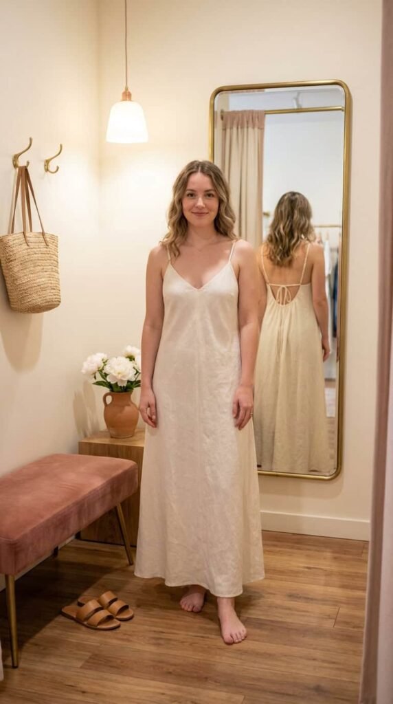 About $50. Affordable linen maxi in cream or butter yellow with thin straps and a slight A-line. The honeymoon outfit for casual exploring days, espresso runs, and Italian-village walks.