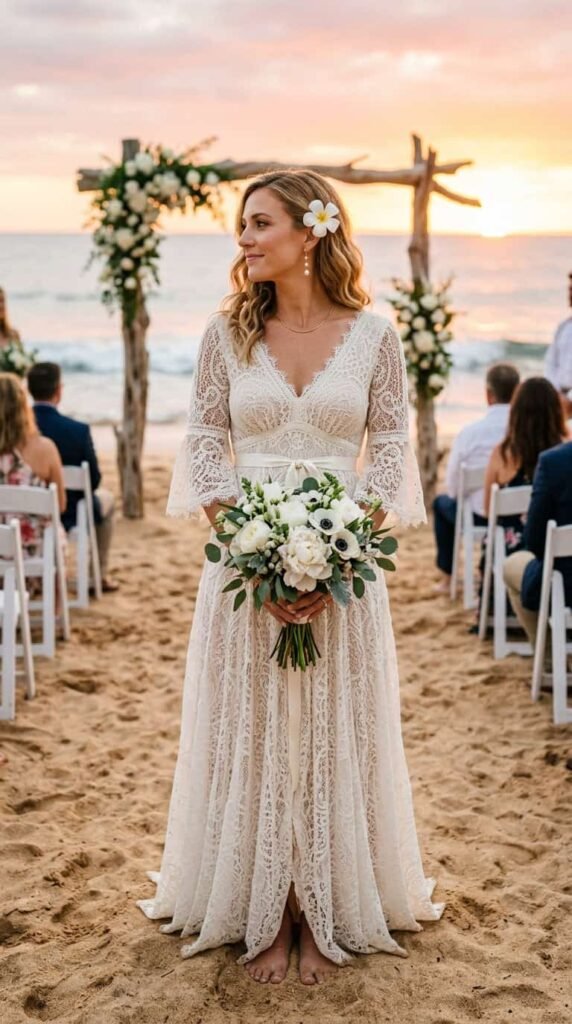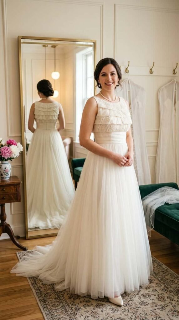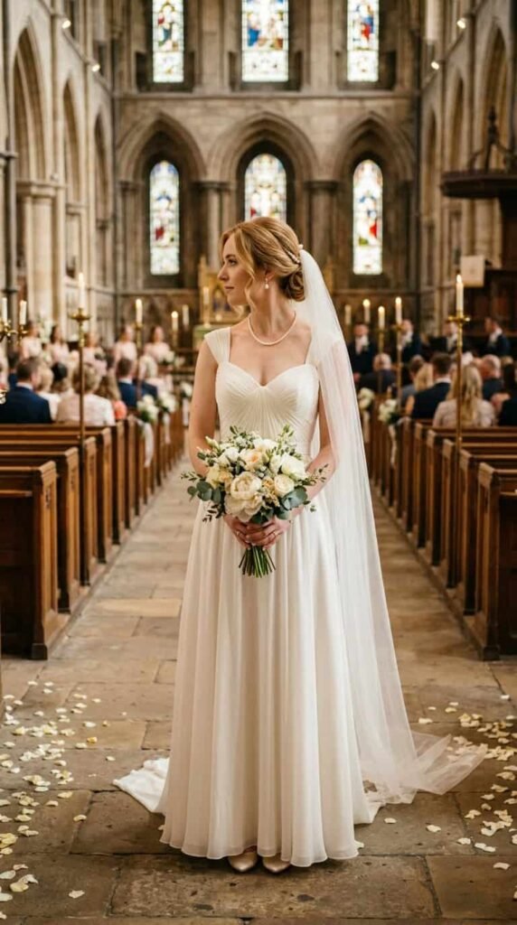 Match the fabric to your venue. Tulle and chiffon for outdoor garden and beach. Silk crepe and satin for modern indoor. Lace and beading for traditional cathedral. The fabric matters as much as the silhouette.