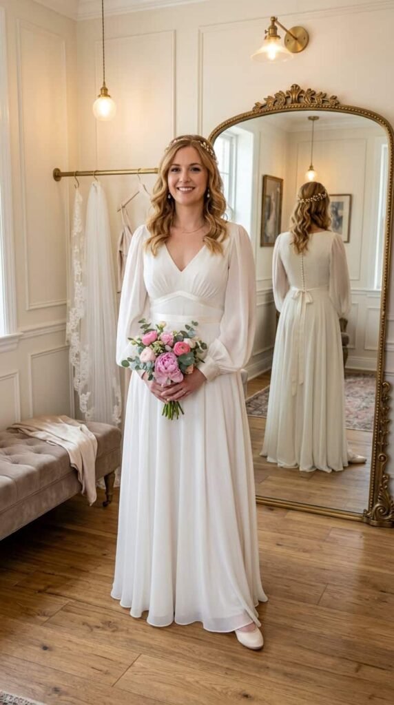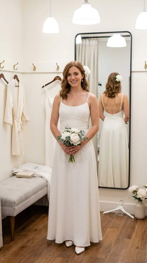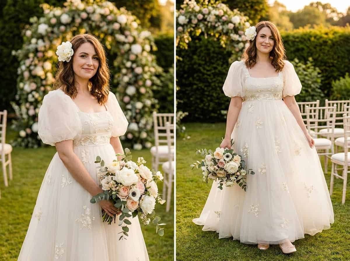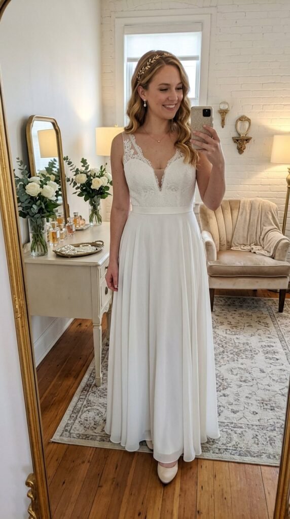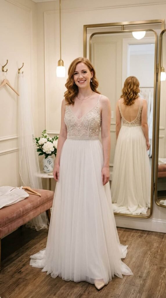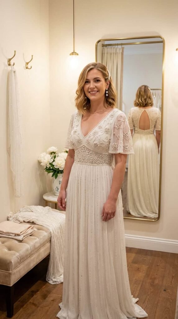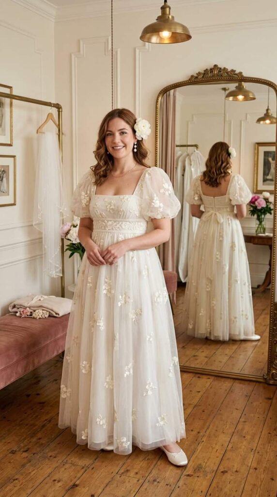 Pay attention to the empire seam height. Some empire waist dresses sit very high (right under the bust) — most flattering for petite and curvy brides. Some sit lower (between bust and natural waist) — more universally flattering and modern. Try both during your appointments.