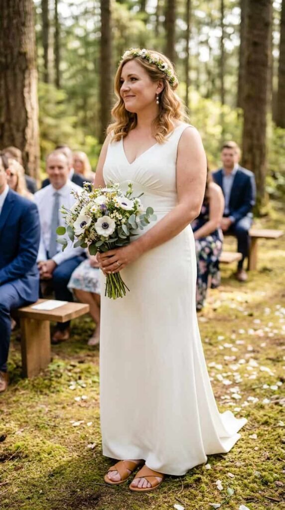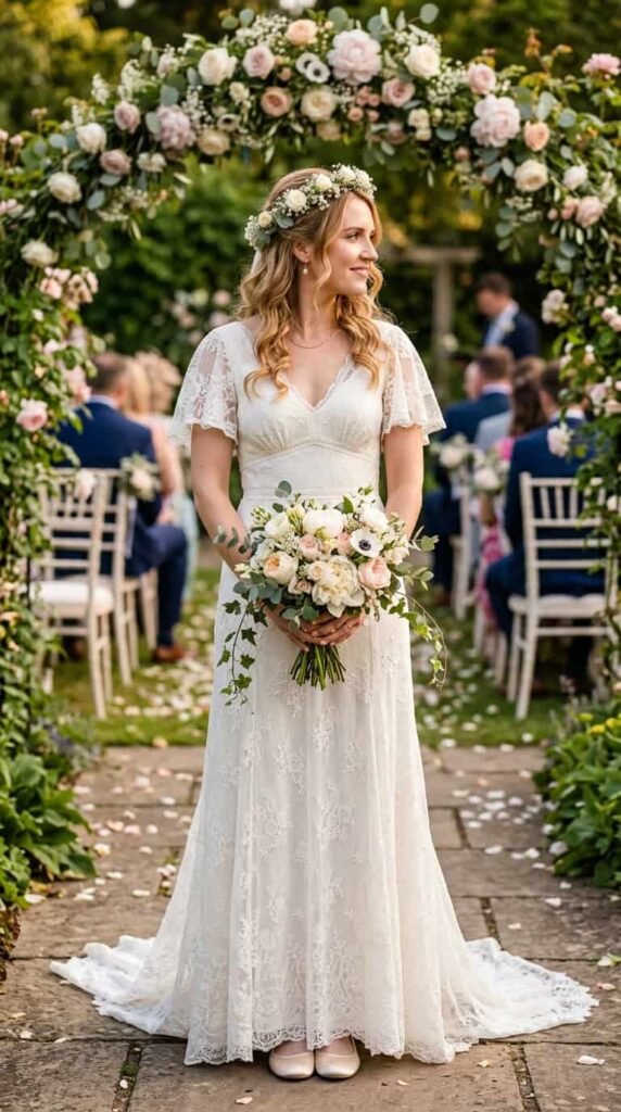 The raised empire waistline sits just below the bust, then drapes loose to the floor. That single design choice solves problems most other silhouettes can’t: petite brides look taller, curvy brides get definition without compression, pregnant brides get a dress that grows with them, and brides who hate corseted bodices get to actually breathe through the reception.