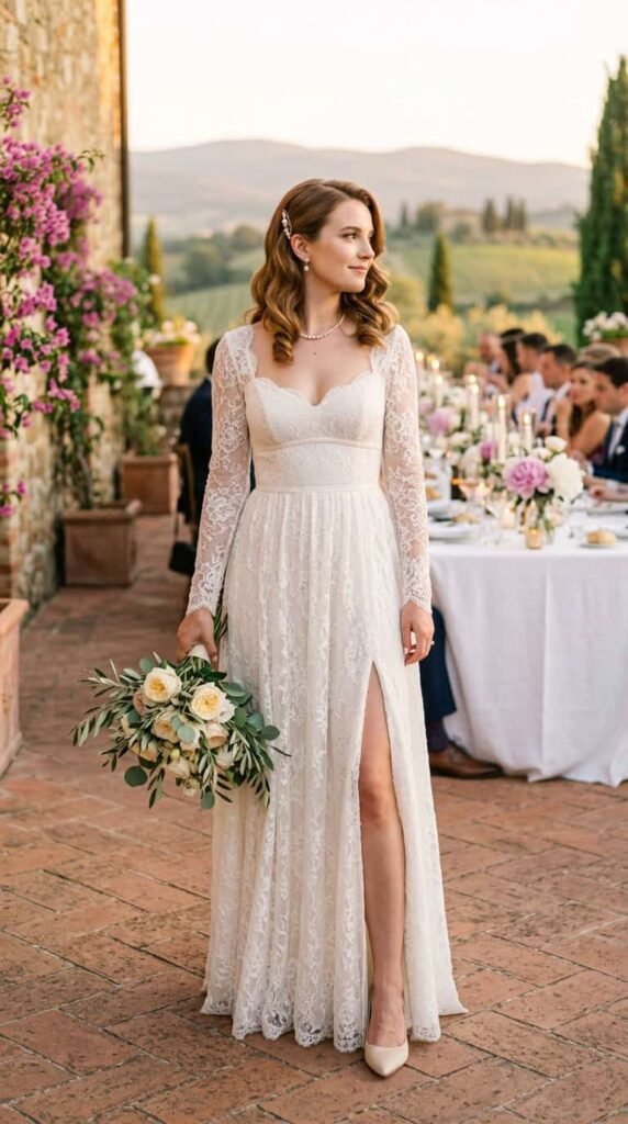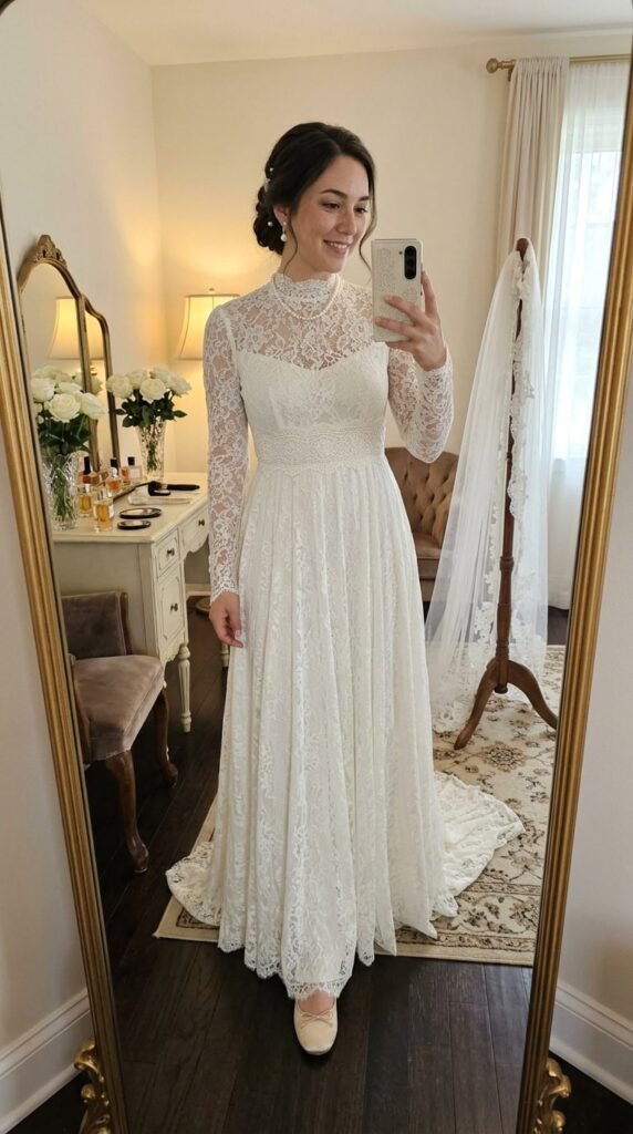 Around $2,800. Full lace empire waist gown with long sleeves and a subtle high neckline. The most-modest empire waist wedding dress on the list — winter and church-ceremony perfect.