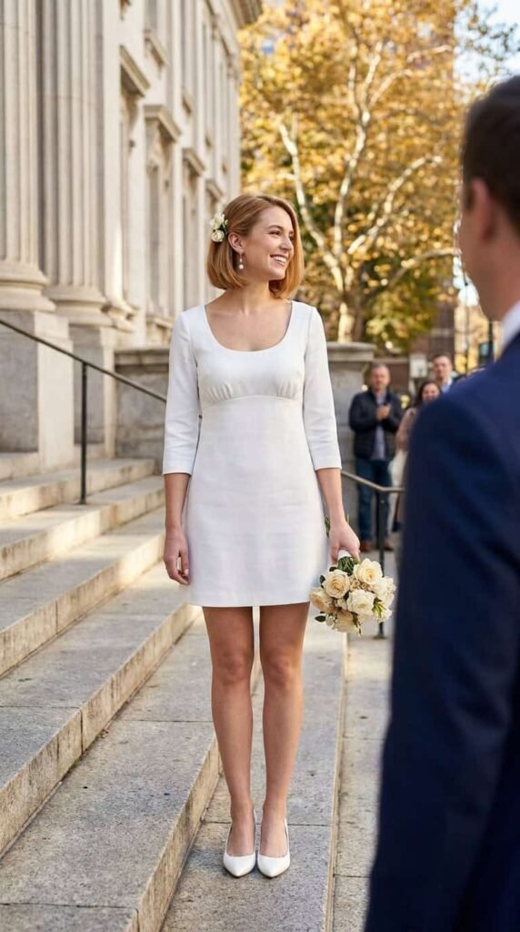 Around $328. Empire waist mini wedding dress in white silk-cotton blend, scoop neckline, three-quarter sleeves. The 1960s mod empire waist wedding dress for elopements, courthouse weddings, and second-look reception changes. The most fun option on this list.