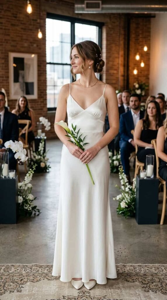Around $498. Bias-cut silk-finish satin slip gown with a subtle empire waist seam below the bust, thin spaghetti straps, and a bias-cut floor-length skirt. The minimalist 2026 empire waist wedding dress for chic city-hall and modern loft weddings.