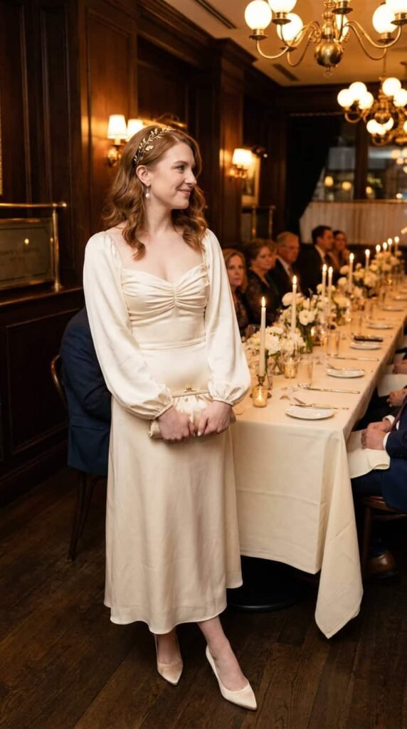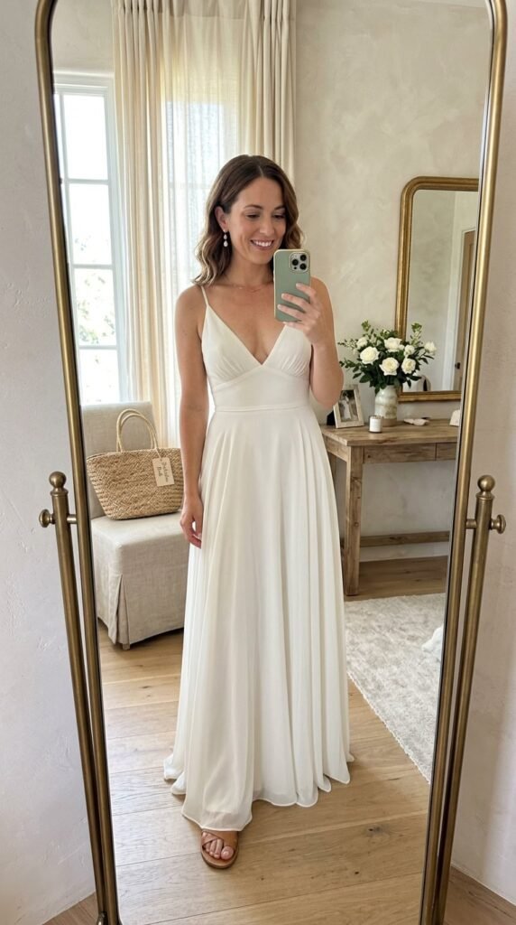 Choose simple accessories. Pearl drops, a delicate gold chain, no statement belts. The dress is the statement.