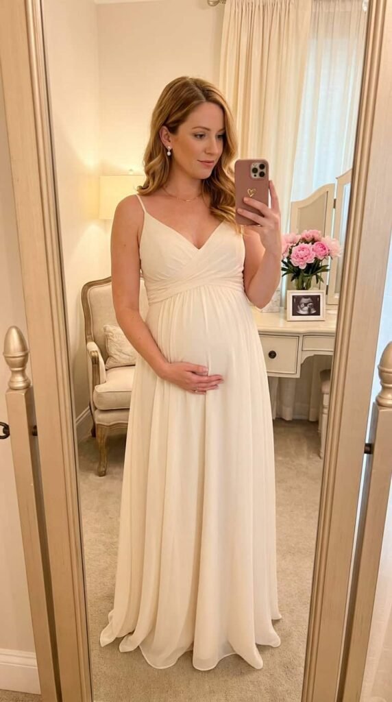 Around $290. Soft chiffon empire waist gown with adjustable spaghetti straps, V-neckline, and a flowy skirt that grows with you. The empire waist wedding dress for pregnant brides between dress fittings and wedding day.