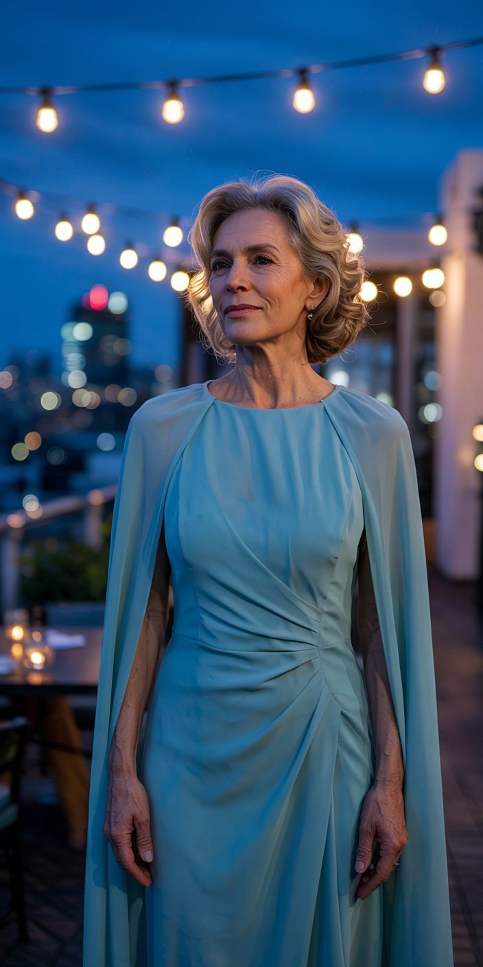 Another luxurious option available at Mytheresa is the Safiyaa “Oria” Caped Crepe Cocktail Dress, priced at approximately $1,815. This pale blue dress is favored by modern royals for its sleek sheath silhouette and the unique attached cape that elegantly drapes over the shoulders. Made from a stretch crepe (a polyester/elastane blend), it provides comfort without sacrificing style. The built-in cape not only adds dramatic flair but also offers a sophisticated alternative to traditional sleeves—ideal for those who prefer more coverage without compromising on contemporary design. Mother of the Bride Dresses That Hide the Belly: Look Elegant & Confident