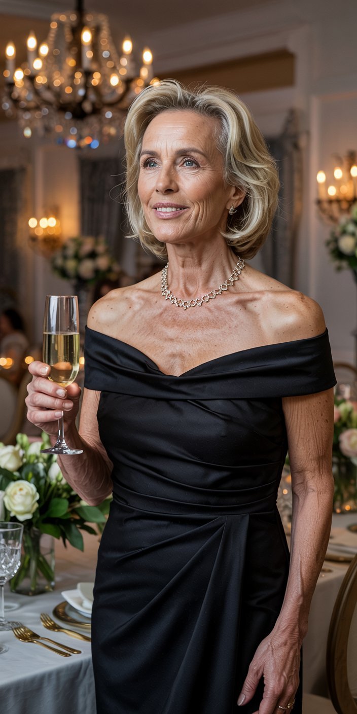 For an ultra-luxurious option, consider the Oscar de la Renta Off-The-Shoulder Drape Cocktail Dress. Available at Shop Simon originally for $4,290—but often on sale for around $2,231—this exquisite little black dress (LBD) redefines cocktail style for mature women. The off-the-shoulder design elegantly exposes the collarbone while keeping the overall look tasteful and sophisticated. With its gracefully draped neckline and impeccably tailored fit, this dress embodies Hollywood glamour in a refined silhouette. It’s perfect for black-tie events, gala dinners, and any formal occasion where you want to steal the spotlight with a classic yet modern LBD.