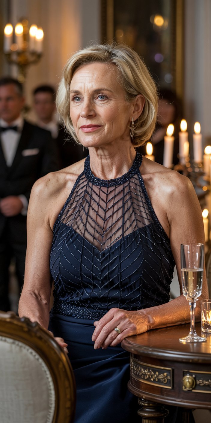 For a dash of sparkle that remains sophisticated, the Ralph Lauren Beaded Mesh Halter Dress is a superb choice. At approximately $395, this navy sheath dress is adorned with an illusion mesh neckline featuring elaborate beading in a linear chevron pattern. The halter design draws attention to your shoulders and collarbones while providing a tasteful, elegant look. The slim, knee-length cut creates a refined silhouette that is versatile enough for cocktail parties, formal dinners, or even evening galas. Its vertical beading adds an elongating effect, making it a flattering option for mature women.
