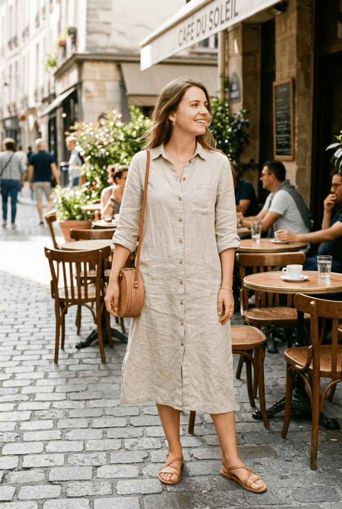 $49 at Uniqlo. This is my “I look put-together but I’m actually going to eat three croissants” dress. The linen is substantial enough that it doesn’t go see-through, the button-down front is relaxed, and the oat color works twelve months a year. I roll the sleeves and add flat sandals. That’s it.
