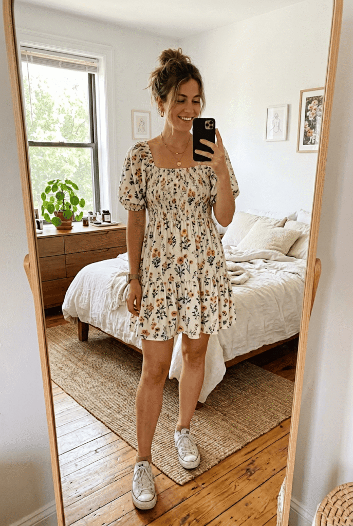 $78 at Free People. The smocked bodice stretches without losing shape, and the floral print is actually cute — small wildflowers, not your grandmother’s curtains. Runs generous in the skirt so it moves nicely.
