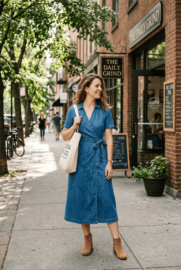 $128 at Madewell. The wrap silhouette keeps it feminine while the denim keeps it casual. Heavier than expected in a good way — it holds its shape and doesn’t wrinkle. My most-complimented casual dress.